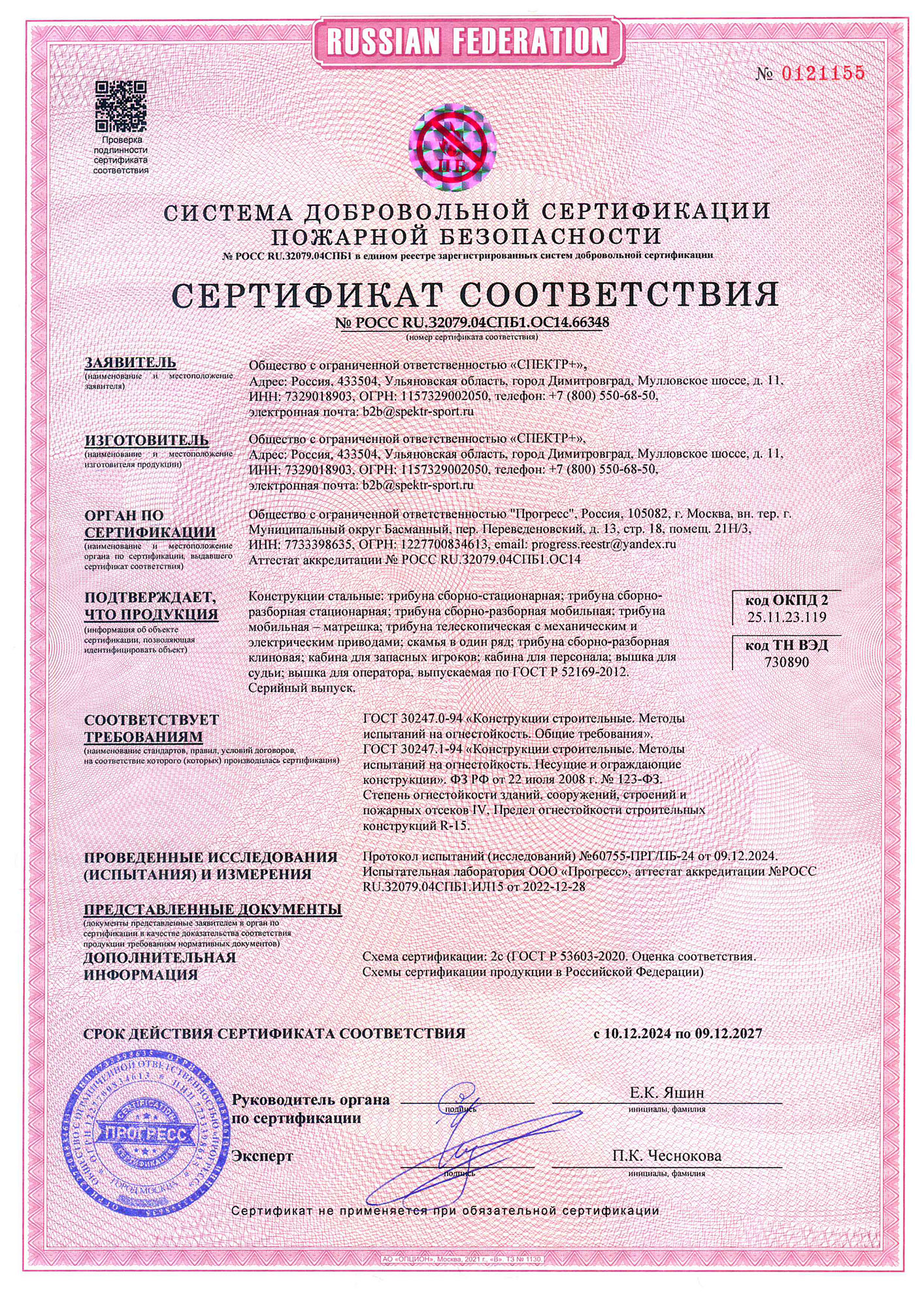 Сертификат соответствия (противопожарный сиденья Арсенал)